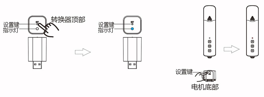 ◆點按轉換器【設置鍵】,當轉換器【指示燈】藍色快閃后,連續點按電機【設置鍵】兩次,電機【指示燈】紅色慢閃;