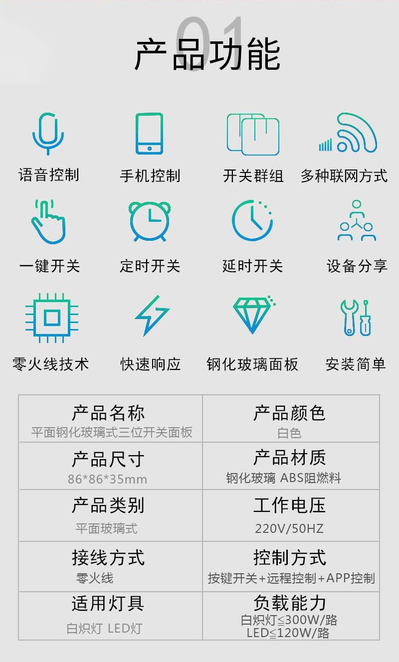 智能觸控平面鋼化玻璃式三位開關面板_百仕誠