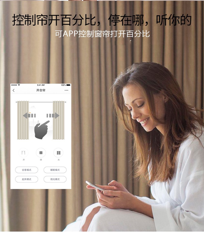 此產(chǎn)品適用于卷簾、柔紗簾、香格里拉簾,改變傳統(tǒng)窗簾手動(dòng)拉升,調(diào)節(jié)遮光的方式,通過語音控制、手機(jī)APP控制、遙控控制等手段,讓您悅享智能生活帶來的便捷與樂趣!